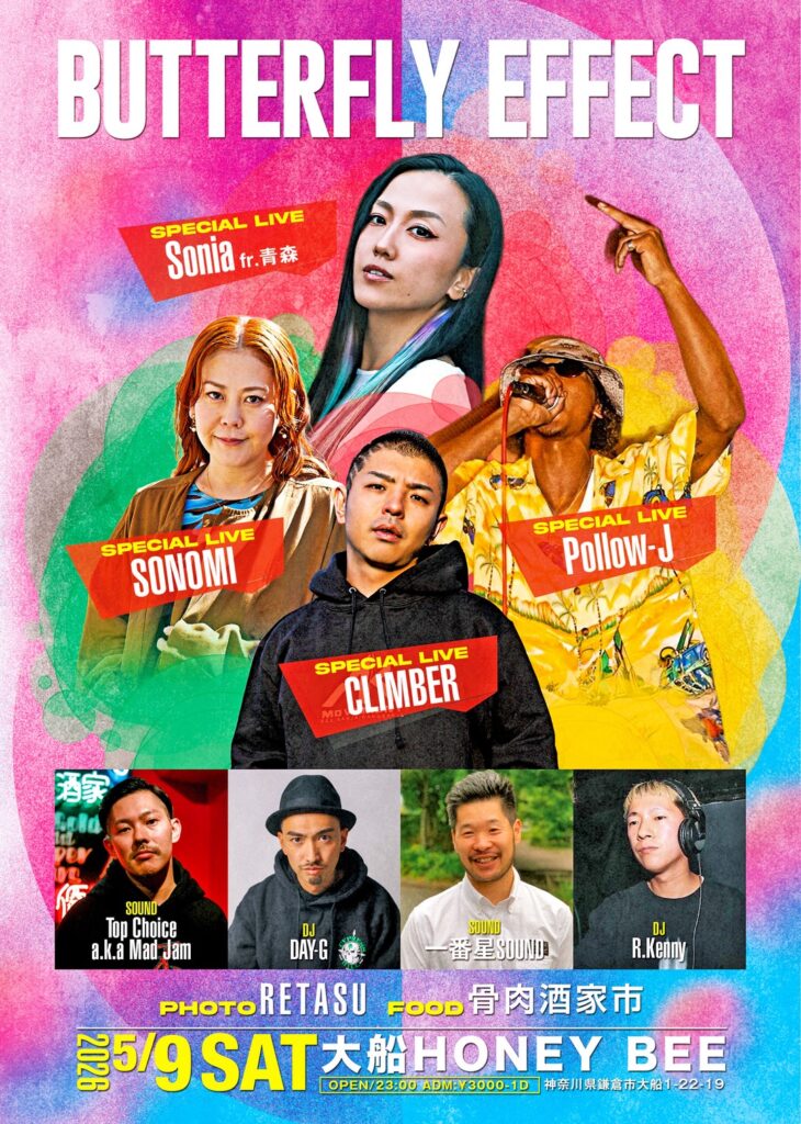 5/9(土) BUTTERFLY EFFECT – 奇数月第2土曜開催 @大船HONEY BEE 2026.5.9(sat)【BUTTERFLY EFFECT】at.大船HONEY BEE神奈川県鎌倉市大船1-22-19 第2三友ビル3F OPEN/23:00ADM:3000yen-1d 【SPECIAL LIVE】Sonia fr.青森SONOMICLIMBERPollow-J 【SOUND&DJ】Top Choice a.k.a Mad JamDAY-G一番星SOUNDR.Kenny 【PHOTO】RETASU 【FOOD】骨肉酒家市