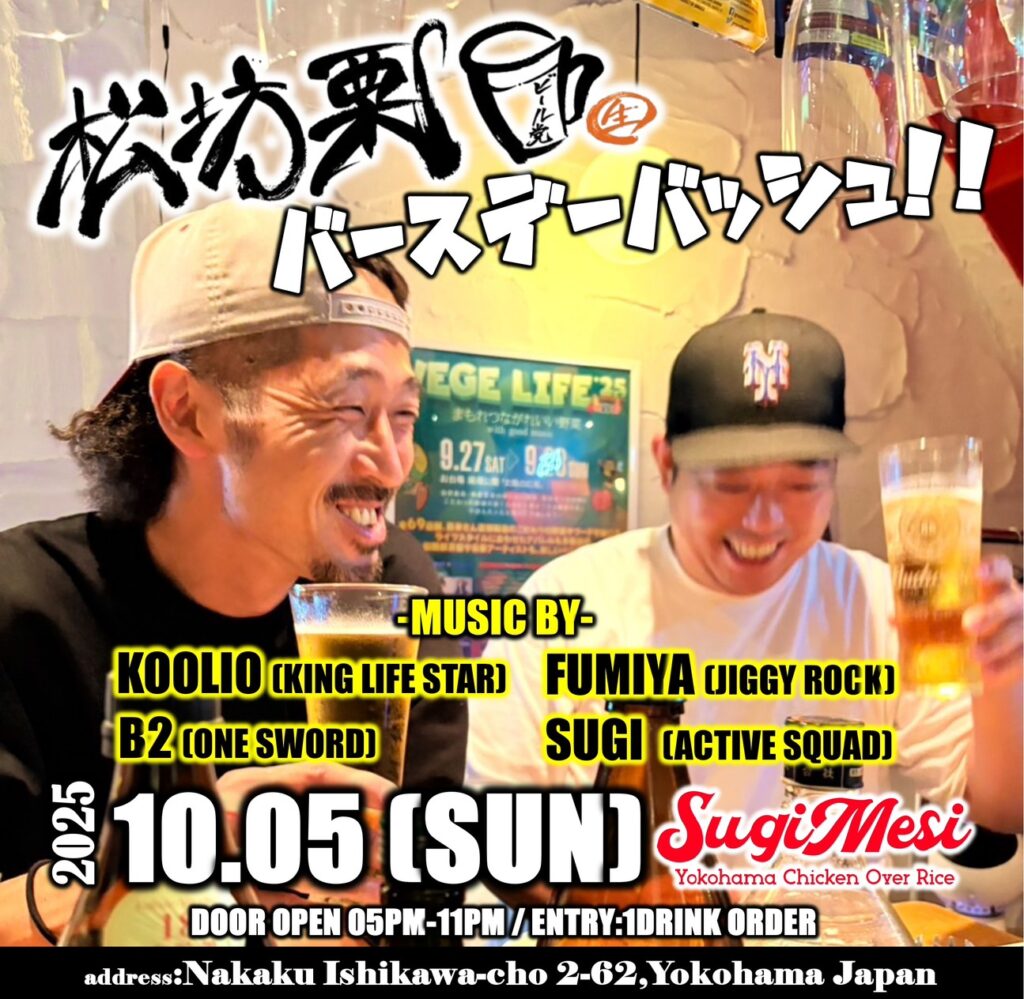 10/5(日) 松坊栗バースデーバッシュ @SugiMesi 2025.10/5(日)@SugiMesi17:00-23:00entry 1 drink order music byKOOLIO (KING LIFE STAR)FUMIYA (JIGGY ROCK)B2 (ONE SWORD)SUGI (ACTIVE SQUAD)